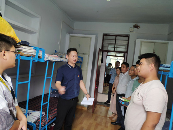 9月10日,太阳集团tyc234cc党委书记周凯,副书记赵贺然、李建伟及全体辅导员老师深入学生宿舍,实地查看新学期学生宿舍设施及卫生情况,亲切看望新老学生。