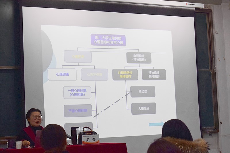 吴芳教授以风趣幽默的语言、生动翔实的案例,阐述了为什么要进行心理健康排查、心理健康排查的程序、大学生心理健康标准、大学生常见的心里困惑和异常心理、心理健康排查的重点关注对象、寝室或班级出现危机事件时我们该做些什么等六方面内容。吴教授强调心理健康排查的重要意义,指出排查可以及时发现心理问题,把问题消灭在萌芽状态,对学生个人和学校都具有重要意义;并结合当代大学生的特点分析了大学生心理健康八大的标准,要热爱生活,乐于学习和工作;了解自己,悦纳自己;接纳他人,与人和谐相处;正视现实,积极适应;善于调控情绪,心境愉悦;意志品质比较健全;人格和谐完整;心理和行为符合自身特点。吴教授对心理健康排查的重点关注对象、大学生常见的心理健康问题以及心理异常问题进行了分类讲解和举例分析,师生们学习了人格完整、心理冲突、心理障碍和精神疾病的特点。最后,吴芳教授强调,当寝室或班级出现危机事件时,学生干部要发挥作用,及时与辅导员沟通,及时拨打求助电话,力所能及的进行紧急救援,遇到新情况及时上报等。整场讲座持续了近三个小时,师生们聚精会神,吴教授就大家提出的困惑和疑问进行了详细解答,最后讲座在热烈的掌声中圆满结束。