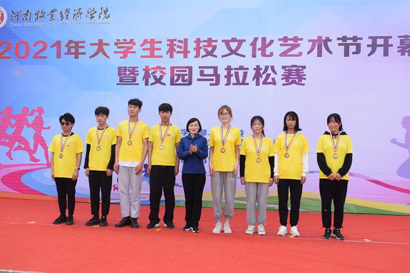 校园马拉松开幕式在精彩绝伦的健美操表演中拉开帷幕,杨宝进校长在开幕式致词中讲道:2021年是中国共产党成立100周年,是国家“十四五”规划的开局之年,更是我校迎接本科教学工作合格评估,实现教育事业发展“三步走”战略目标第一步的关键之年。马拉松是校园科技文化艺术节的第一场全校性活动,用运动强身健体,在体育运动中展示牧经学子风采、发扬牧经精神。开幕式上,裁判员代表宣布校园马拉松竞赛规程,领导为各学院代表队授旗。