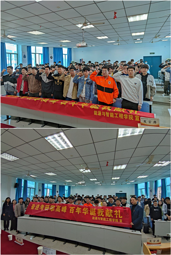 会上,能源动力工程教研室主任张品和机械工程教研室主任蒋爱德分别就能源与动力工程专业、农业机械化及其自动化专业做专业前景分析和考研目标院校介绍,并结合自身经验和我院2019届、2020届学生考研情况,提出了针对性建议。鼓励同学们在毕业来临前,早谋划,早打算,树立考研目标,合理进行考研备考;接着来自2017级农业机械化及其自动化02班的曹永研同学,作为2020届考研优秀学生代表进行考研经验分享,曹同学就院校选择、复习方法、复习资料的选择、复习时间、复习心态以及复试几个板块等为同学们做了详细介绍;本次考研动员大会在学生们慷慨激昂的考研宣誓中结束,会后全体学生郑重地在“奋进考研攀高峰百年华诞我献礼”主题条幅上签下自己的名字,表达考研的信心和决心。