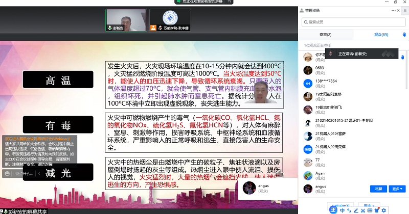 为进一步增强我院师生的消防安全意识,提升师生自护自救能力,确保师生生命财产安全。我院特开展2022年火灾警示宣传教育月活动--邀请保卫处消防科彭新安副科长为我院师生开展“关注消防,守护平安”消防安全专题讲座。此次讲座于2022年5月25日晚以线上形式开展,我院师生代表参加了此次讲座,讲座由我院党政办主任耿李姗主持。