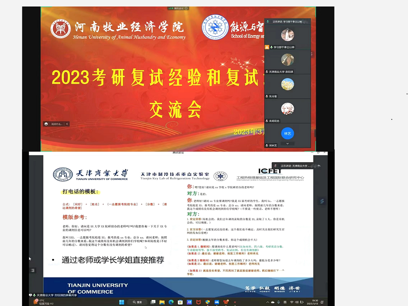 为了加强学院学风建设,做好2023年研究生复试帮扶工作,进一步提高毕业生考试复试成功率和调剂成功率,3月11日晚,太阳集团tyc234cc举办了2023届考研复试和调剂经验交流会,会议邀请到2022年考入上海理工大学的刘兴生和天津商业大学的吉钰琪担任主讲,全体2023届考研学生参加了本次交流会。