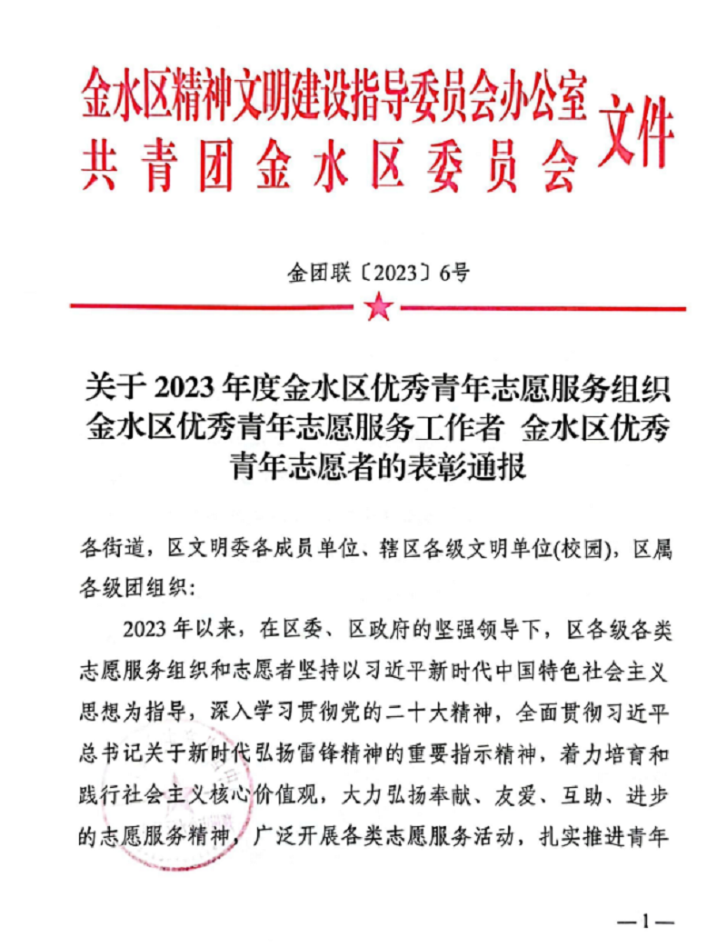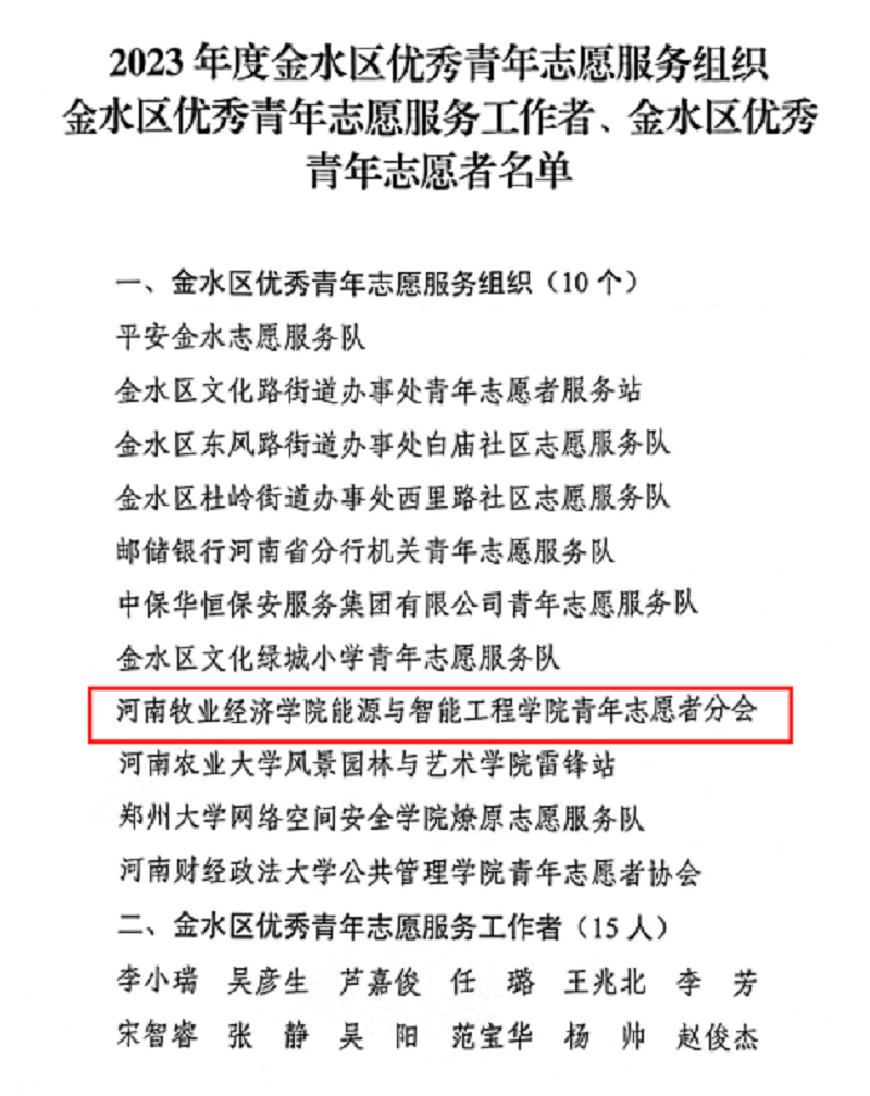 近日,郑州市金水区精神文明建设指导委员会办公室、共青团金水区委员会联合颁布了《关于2023年度郑州市金水区优秀青年志愿服务组织金水区优秀青年志愿服务工作者金水区优秀青年志愿者的表彰通报》。我院青年志愿者分会荣获郑州市金水区优秀青年志愿服务组织、我院团委吴彦生老师荣获郑州市金水区优秀青年志愿服务工作者称号、21建环班谢君瑶同学荣获郑州市金水区优秀青年志愿者称号。