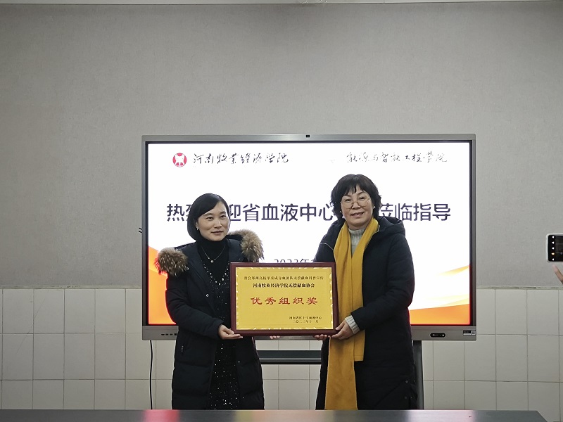 院党委副书记党美珠首先对张淑琴主任一行的到来表示了热烈欢迎。张淑琴主任为我院无偿献血协会颁发“省会郑州高校单采成分血团队无偿献血科普宣传优秀组织奖”。她表示:此次河南省红十字血液中心联合省会郑州九所高校举办血液知识线上答题活动,太阳集团tyc234cc无偿献血协会广泛动员、积极参与、答题成绩名列前茅,荣获“省会郑州高校单采成分血团队无偿献血科普宣传优秀组织奖”,感谢太阳集团tyc234cc无偿献血协会对大学生无偿献血科普宣传所做出的工作和努力,对此次协会的获奖表示热烈的祝贺!近期,受天气寒冷等因素影响,全省采供血工作面临严峻考验,血液采集量大幅下降,临床血液供需矛盾不断加剧。我们省红十字血液中心呼吁各大高校积极动员广大青年大学生积极参与无偿献血活动,以挽袖之力,奉献热忱爱心。