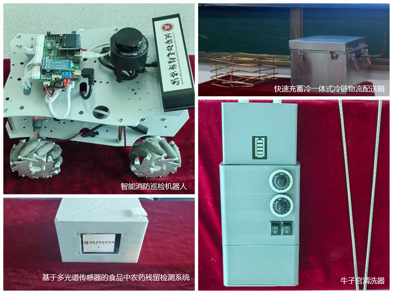 在学院浓厚的科创氛围的影响下,同学们参赛热情高涨、踊跃报名,共有27个作品、近300名师生共同参与。汇报展示环节,参赛选手通过PPT演示、实物展示、视频动画展示等多种形式对项目的社会价值、实践过程、创新意义、发展前景、团队协作进行了详细汇报,各评委老师从项目科学性、创新性、可行性及商业模式、团队实力等多个维度进行了严格公正的评审指导,提出宝贵意见和建议。参赛项目涉及多个方面,其中既有Graphene-高效便携式黑科技空调、无人托管-羊舍智能巡检机器人等与学院专业特色结合紧密的科技项目,又有Multi-powerP多功率可拆卸式充电器、基于多光谱传感器的食品中农药残留检测系统等改善生活品质的创新项目,体现了我院学子严谨求实的专业态度,勇于突破、创新的精神风貌。