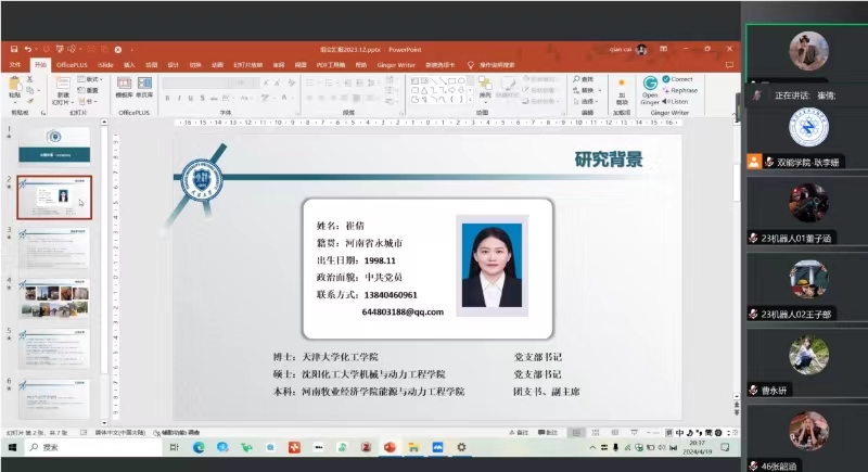 崔倩,2016级能源与动力工程专业04班的毕业生,在校学习期间担任班级团支书、院学生会副主席,2020年崔倩以优异成绩考研至沈阳化工大学深造,目前在天津大学化工学院攻读博士学位。分享会上,崔倩向学弟学妹们介绍了自己的学习经历和求学路上心得体会,强调了本科生应注重基础知识学习,将专业课程基础打牢,平衡好学习、工作、生活之间的关系,戒骄戒躁,善于管理时间。崔倩表示自己的成长与母校的培养密不可分,建议学弟学妹们珍惜在校时光,有机会积极参加各类活动,见贤思齐,明确学习目标和自身发展方向,注重综合素质能力的培养。与会同学认真听讲,积极互动,会场气氛热烈,同学们纷纷表示要以崔倩学姐为榜样,向崔倩学姐学习。