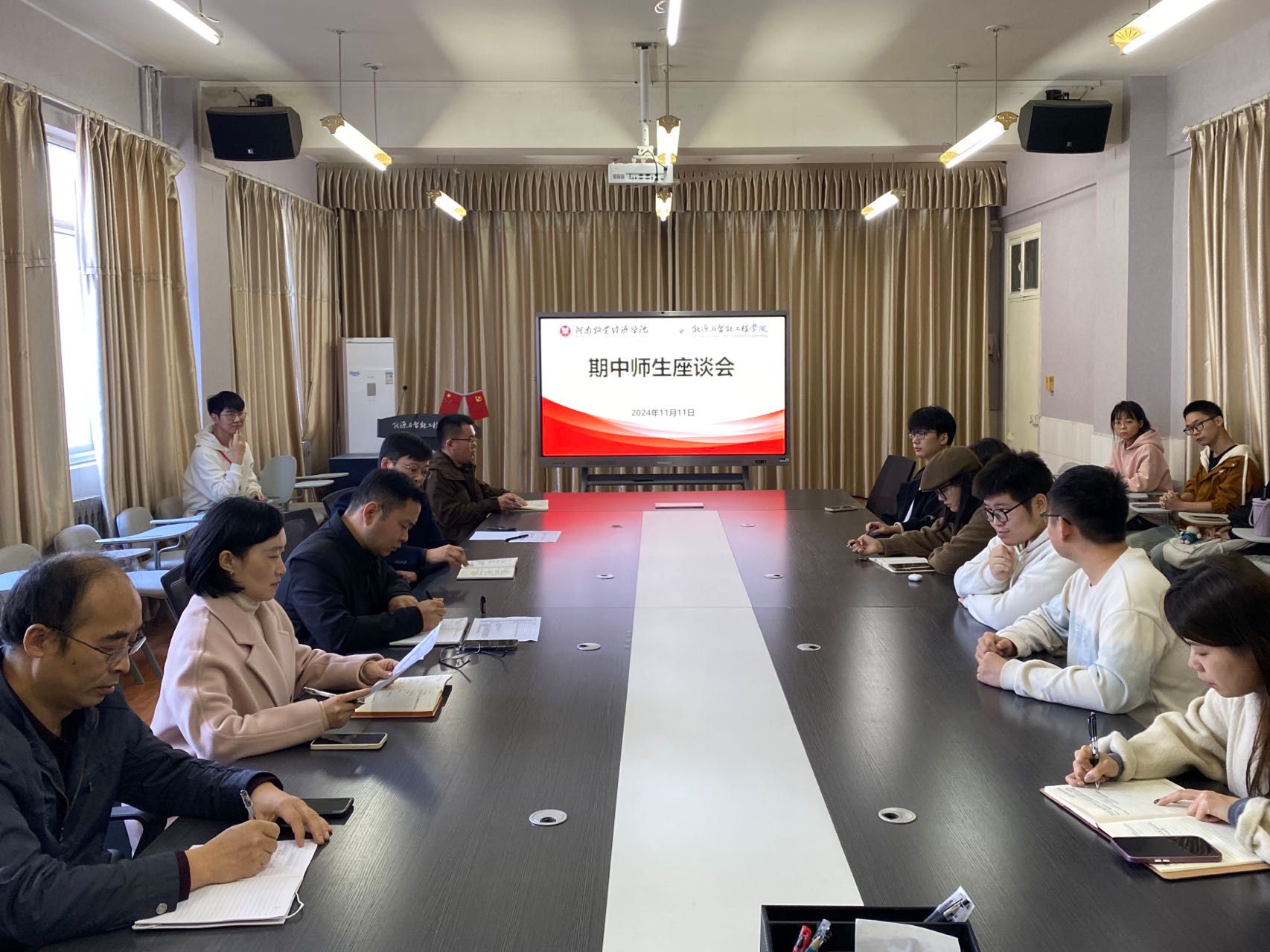 为检查本学期的教学工作,了解学生的思想动态和学习生活状况,扎实推进日常教学和学生管理工作见实效,促进师生共同进步。2024年11月11日中午,我院在学院会议室召开了本学期期中师生座谈会。学院党委书记赵贺然、院长王硕、副书记党美珠、副院长刘群生、各教研室主任、院团委副书记李永振及各班代表参加座谈会。会议由教学办主任崔明倜主持。