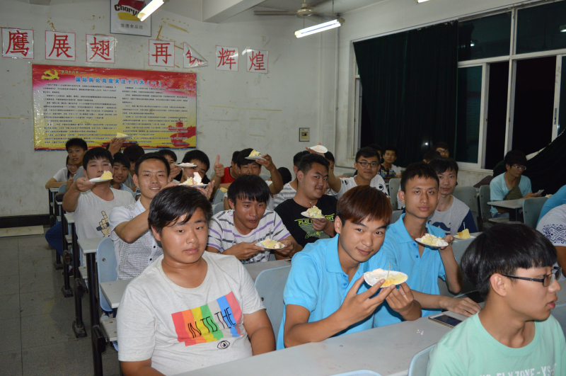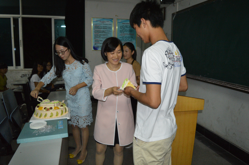 名新生中的“幸运儿”,学长学姐们精心设计有“同学,加油”字样的双层彩色蛋糕让寿星们感动的热泪盈眶,寿星们对着闪烁的烛光许下了他们美好的愿望,辅导员耿李姗老师的话“这里是你们的新家,希望你们在这里快乐成长”让新同学们倍感温暖;党老师传达了系领导对新生们的关怀和祝福,为小寿星们送上蛋糕、礼物,并勉励新生让梦想在这里启航,接下来齐唱生日歌、学唱校歌庆校庆、齐闹寿星“蛋糕面具”等环节又将整个活动推向了另一个高潮,欢笑声不断。活动在美食、蛋糕、鲜花和同学们的欢乐声中圆满结束。