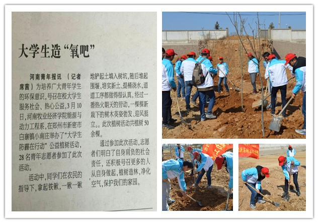 在全国第38个植树节到来之际,为培养广大青年学生的环保意识,提升在校大学生服务社会、奉献公益的内涵素质,3月10日,能源与动力工程系青年志愿者协会分会组织28名志愿者在郑州市新密市白寨镇小南庄开展了“大学生防霾在行动”义务植树活动。