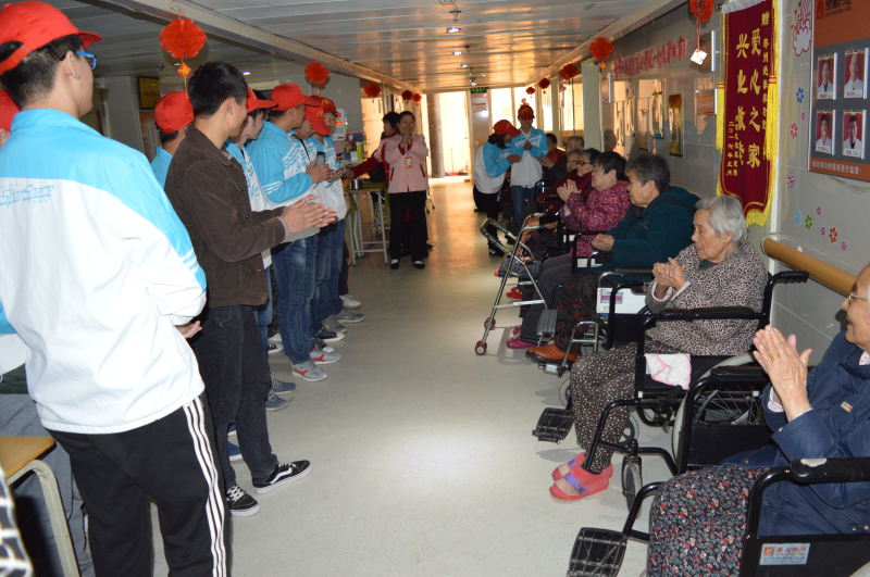 “老吾老,以及人之老”,志愿者们到养老院后为老人洗脚按摩,在工作人员的带领下,为六层、七层的老人们洗脚,志愿者们认真细心,边洗边跟老人们聊天,耐心聆听老人们讲以前的故事,气氛十分融洽,其中一位老人感动得说到:“我自己的孩子都没给我洗过脚……”志愿者们按摩着老人起蛮茧子的双脚,明白这是老人们一生勤劳的印记;随后,志愿者们为老人们准备了精彩的节目,有小合唱《强军战歌》、流行歌曲《父亲》、手语《感恩的心》等,老人们非常高兴,鼓掌称赞;还有一些志愿者们陪老人们下起了军旗、象棋,给老人按摩等等,整个养老院充满着欢笑,涌动着暖流,最后离开时,老人们拉着志愿者们的手,依依不舍。