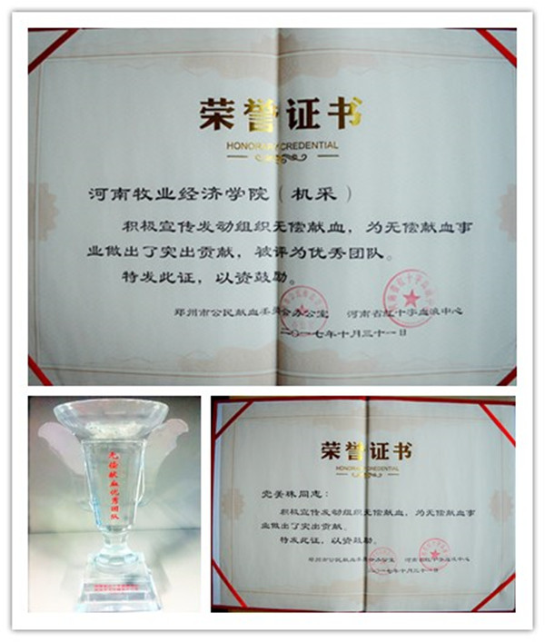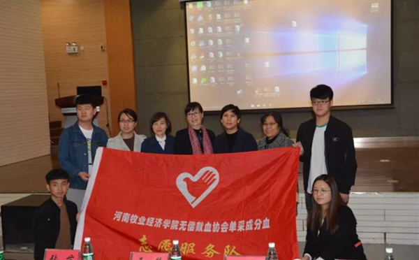 2017年11月4日,由郑州市公民献血委员会和河南省红十字血液中心共同举办的“2017年省会郑州高校无偿献血工作座谈会”在河南工业大学召开。河南省教育厅营养办主任高根立、团省委社会联络部副部长王慧、省红十字血液中心副主任李建斌、省直团工委主任科员张苗等领导出席。我校无偿献血协会受邀参加,并被授予“2017年省会高校无偿献血优秀团队奖”,党美珠老师被评为推进高校无偿献血工作优秀指导老师。