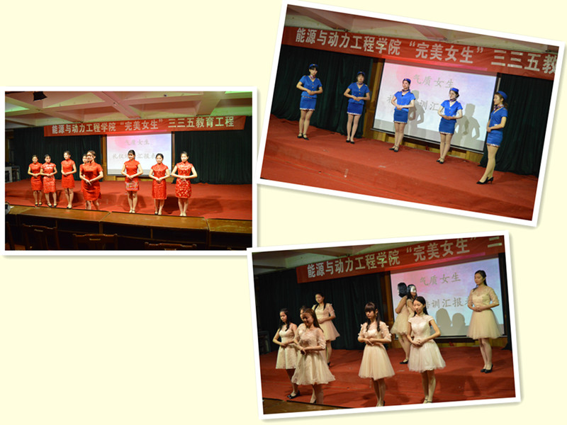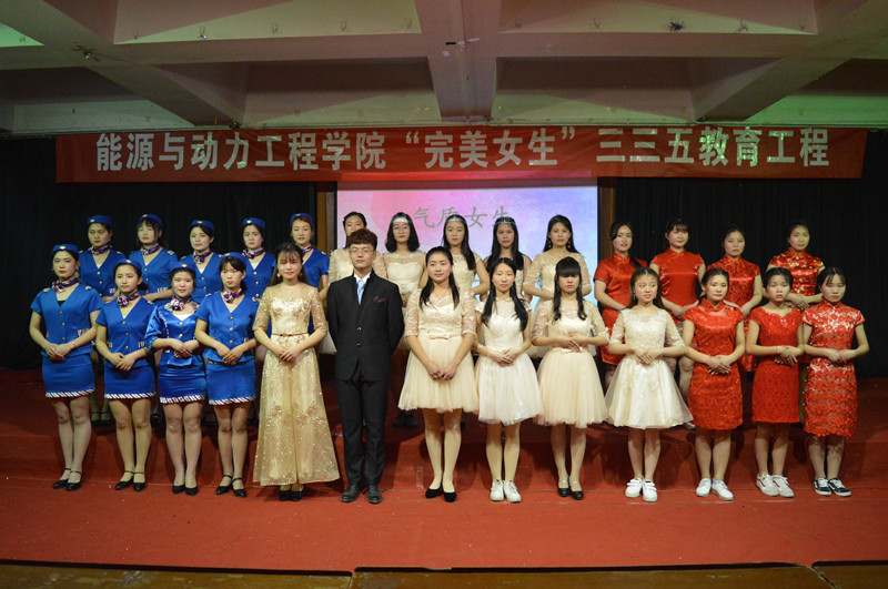 气质女生礼仪培训是能源与动力工程学院“完美女生”三三五教育工程的重要组成部分,历时一个月,前期组织女生观看礼仪培训视频,并现场讲解、演示;利用课余时间对女生进行专门礼仪培训,包括基本的站姿、坐姿、走姿等文明礼仪;通过选拔、考核等层层环节共挑选出40名女生组成6个代表队进行礼仪汇报表演。