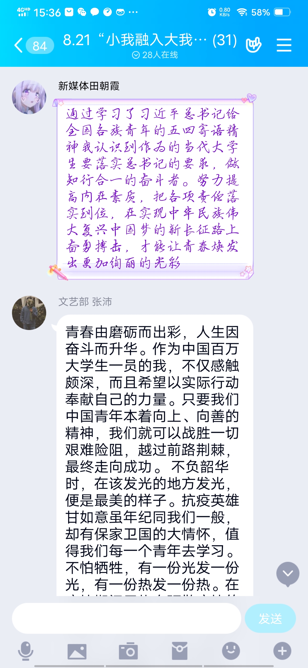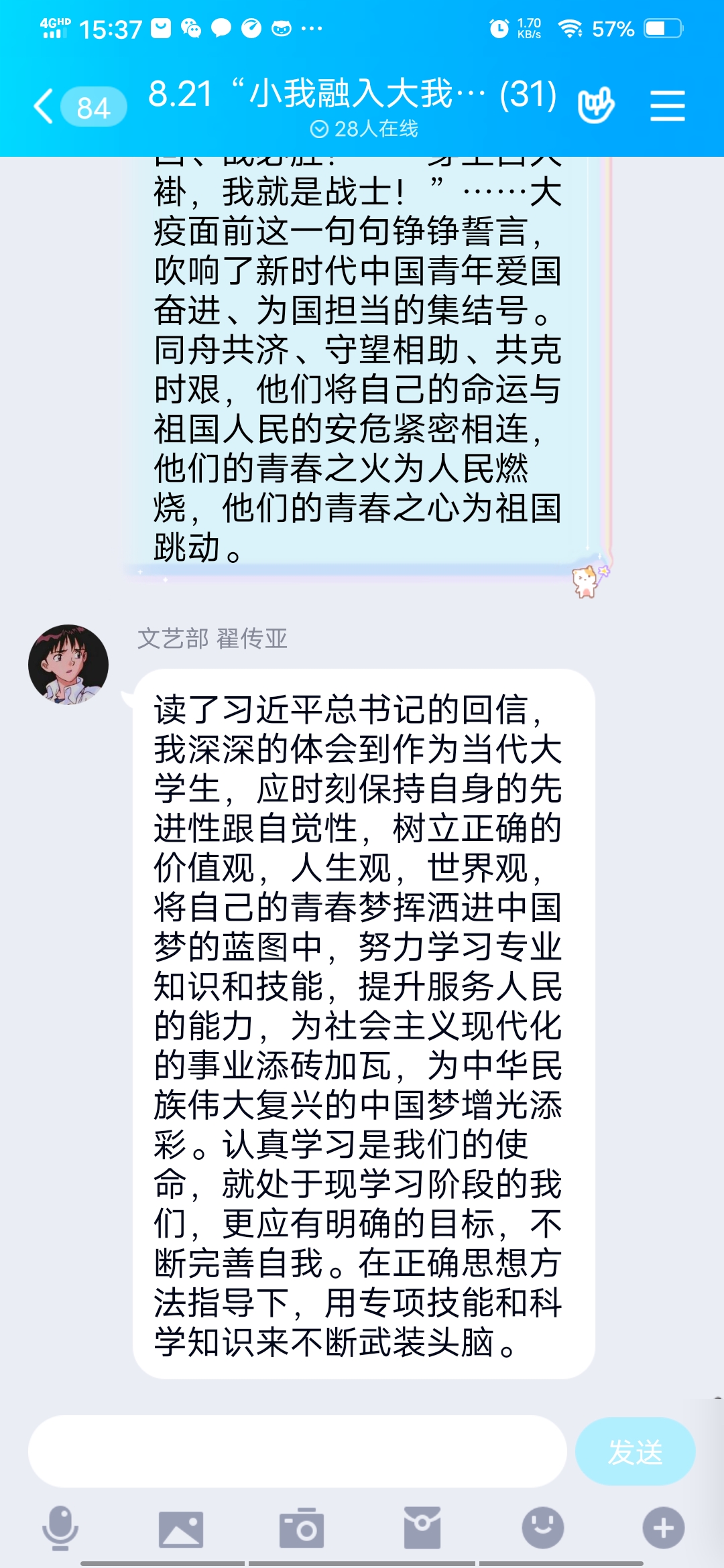 活动伊始,丁子怡同学带领大家共同学习了习近平总书记五四寄语、北京大学援鄂医疗队全体“90后”党员回信、复旦大学《共产党宣言》展示馆党员志愿服务队全体队员回信、中国石油大学(北京)克拉玛依校区毕业生回信精神、以及“习近平与大学生朋友们”系列访谈实录。然后同学们结合学习内容和社会实践,积极交流发言,纷纷发表自己对融入大我的看法。其中,赵雅诗同学表示“通过学习习近平总书记的寄语,我懂得了青春就是要奋斗,我们当代青年要继续发扬五四精神,以实现中华民族伟大复兴为己任,不辜负党的期望,民族的重托,不辜负这个伟大的时代”,李之龙同学表示“今年是决胜全面小康、决战脱贫攻坚,实现两个一百年奋斗目标的交汇之年,身为团员的一份子当然要继承和发扬五四爱国精神,坚定理想信念,始终保持艰苦奋斗的前进姿态”。最后,黄润芸老师对大家的观点进行总结,鼓励同学们要积极投身祖国建设,让青春为祖国绽放。