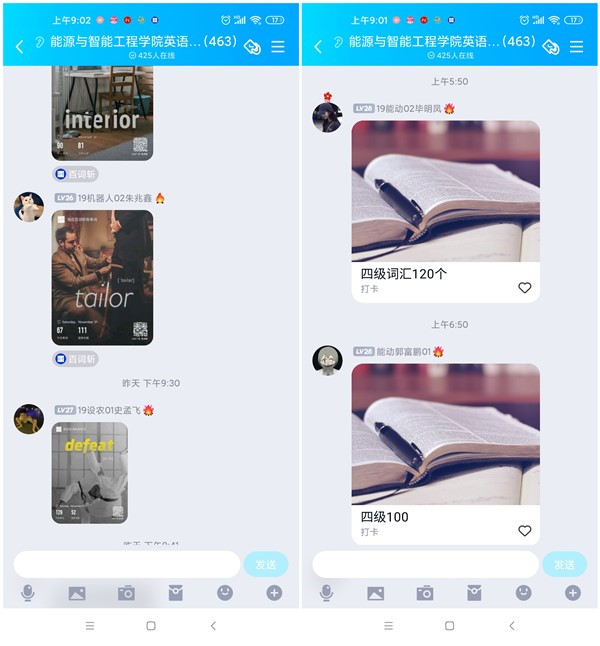 活动开始之前,通过我院新媒体官方平台宣传,鼓励同学们自愿参与,积极加入太阳集团tyc234cc21天四六级打卡学习群;活动期间,同学们积极性很高,每天坚持早上8:30之前根据自身情况发当天学习计划,如四级计划,今日百词斩四级核心单词50个等,六级计划,今日百词斩六级核心单词45个等,每人每天晚上睡觉之前群里打卡汇报学习战果。据统计,从活动开始以来,我院共有400余名同学参与到本次活动中来,同学们学习自觉性得到了进一步提高,学习氛围愈发浓厚。坚持了31天打卡学习的19级能动02班毕明凤同学说到:“学习打卡虽然是一种形式,但是通过每天的学习,这种形式已经内化于心,每天学习已成为一种习惯。”19级设农01赵雅诗同学说到:“虽然打卡活动结束了,但是我们的学习群依然存在,我们会继续坚持学习打卡。”不少同学感叹学习有这样的“仪式感”真好,这是一段快乐的打卡学习时光,能够帮助并带领同学们快速从假期状态中回归学习生活。