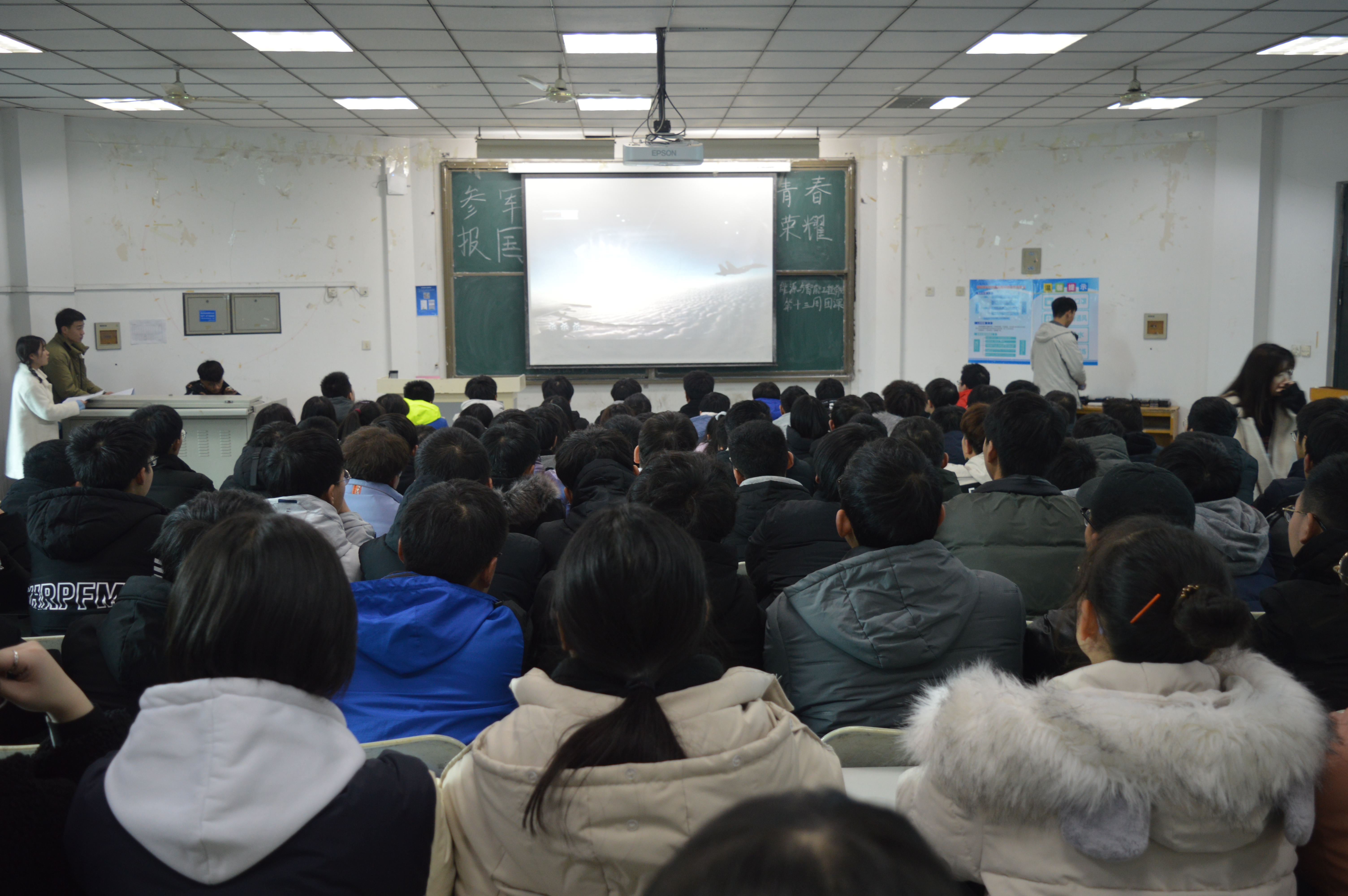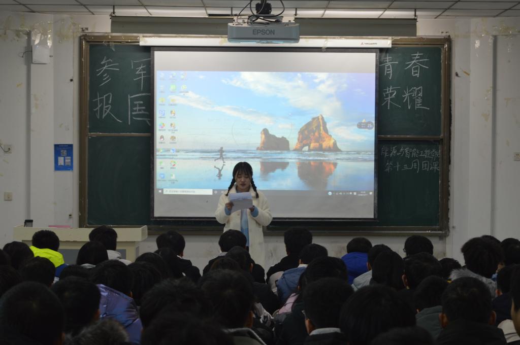 首先,大家观看了国军网征兵宣传视频,视频中把中国军人在祖国社会主义建设事业中勤劳勇敢、吃苦耐劳、不怕困难的品质体现得淋漓尽致,同学们从心中升起对他们由衷的敬佩之情。随后,团支书组织班级节目依次上台表演,演讲、朗诵、诗歌等形式多样。其中20机器人01班宋铮同学演讲的《参军报国 青春无悔》向我们传达了他对参军的渴望:人就像是一只远航的小船,漂泊在广袤的大海上。要想胜利地到达理想的港湾,必须经得起无数次的风浪,还必须有盏不灭的灯塔,指引着前进的航向。无数次的风浪便是人生道路上的无数个坎坎坷坷;那盏不灭的灯塔是人心中执着追求的目标。指引着他前进的那盏灯塔是他对绿色军营的向往,以及献身军营的志向和理想。最后,各班团支书强调,新一代青年学生,有义务亦有担当,身负责任与使命,为国为民砥砺前行。
