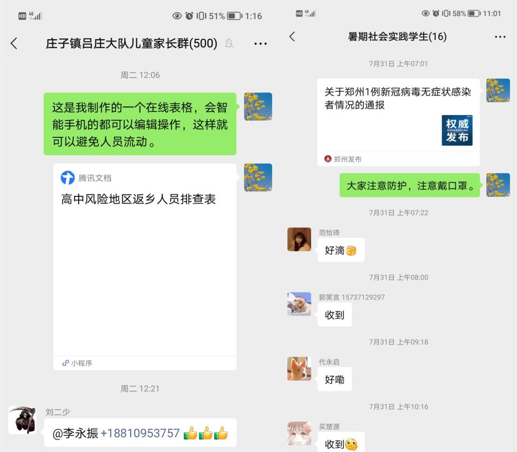 当社区群众有需求之时,党员就应该是在身处一线的前锋。李永振老师为做好返乡人员的登记备案工作,他在社区微信群中制作返乡人员信息登记在线表格,最大限度减少人员的流动。为切实筑牢庄子镇疫情防控防线,面对开展全镇全员核酸检测的通知,李永振老师主动请缨,积极联系社区党支部,一方面做好疫情防疫宣传工作,另一方面认真组织社区居民并登记居民核酸检测个人信息,累计登记人数达1600余人次,获得了社区群众的赞许。