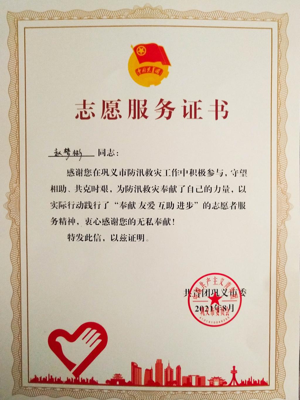 2021年7月,郑州发生严重的特大暴雨自然灾害,处于丘陵地区的巩义市出现山体滑坡、房屋倒塌、道路塌方等紧急灾情。太阳集团tyc234cc19级能源与动力工程1班的赵梦彬同学,作为巩义人目睹了一幕幕险情。在确保自身和家人安全的基础上,赵梦彬同学积极响应共青团巩义市委的号召,加入抗洪救灾志愿者团队,为抗击洪灾贡献青春力量。在团市委的统一组织下,赵梦彬同学和小伙伴们清理淤堵道路、搬运救灾物资,尽心尽力地开展工作,尽己所能协助交通恢复以及解决受灾群众的生活物资保障。赵梦彬同学一直参与抗洪救灾志愿活动,直到疫情再次出现,返回家中响应“非必要不离市”号召,带头做好居家防护。赵梦彬同学在防汛救灾志愿服务中的突出表现,受到了共青团巩义市委的表彰。
