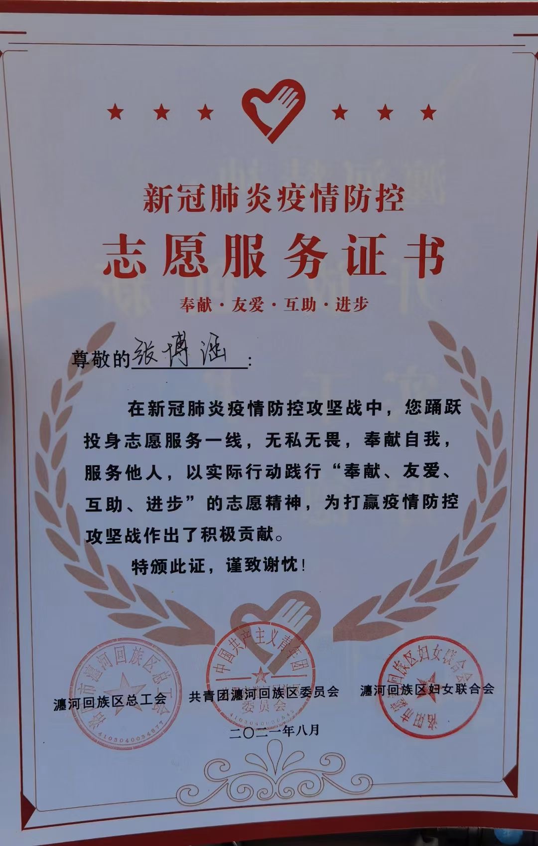 在疫情防控中,张博涵同学积极参与到防控疫情的志愿服务中,用实际行动助力家乡的疫情防控,诠释了当代大学生有责任、敢担当、能奉献的精神,展现了新青年的时代风采。