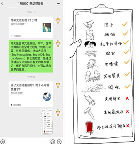 在本次课前十分钟活动中,志愿者们认真学习了与艾滋病预防相关的知识,播放宣传视频,并向大家做认真讲解,帮助更多的同学知道艾滋病的危害、传播途径、紧急情况处理、正确的预防方法以及正视艾滋病人。校医院举办“世界艾滋病日”的线上答题活动,我院学生也积极参与,并获得多个奖项。另外,同学们也利用微信、QQ等平台,以分享科普知识的方式,宣传与艾滋病防治有关的基本常识,号召大学生们动员起来,提升艾滋病防控知识的宣传实效。