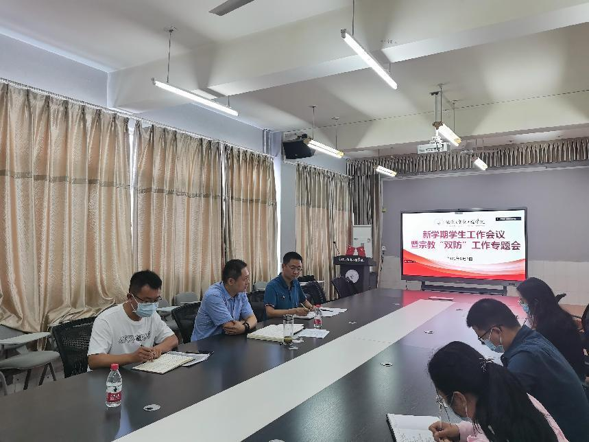 会上,周凯带领全体学工队伍深入学习贯彻习近平总书记关于宗教工作的重要论述和重要指示精神,全国、全省和学校的宗教工作会议精神,对宗教“双防”工作进行了理论概念的深入讲解,从九个“必须”强调了高校宗教“双防”工作的重要性,并就学院的宗教和意识形态工作对学工队伍进行工作安排并提出了要求。他强调,在疫情常态化形势下,学生工作具备普遍性和特殊性相结合的特点,在普遍的常务性工作做好的前提下,对特殊性工作要有预判并提前做好谋划,掌握重点事,抓好重点人,把握重要节点,突出学工队伍的专业性,在确保校园安全稳定的基础上,弘扬太阳集团tyc234cc的优良院风、教风和学风。