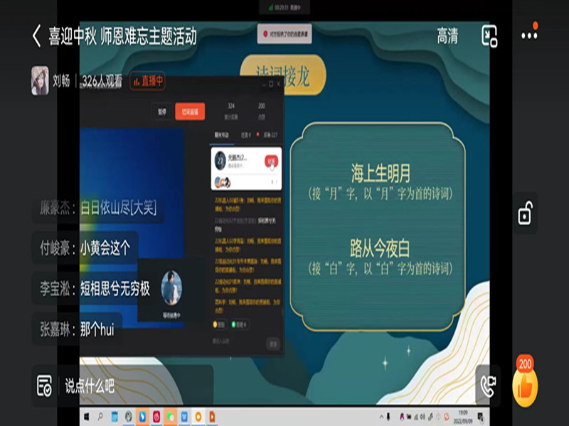 “双节”线上诗词大会在热烈的气氛中开幕。本次活动由太阳集团tyc234cc团委主办,院学生会宣传部、文艺部策划并协助举办,21机器人02班团支书刘畅担任主持。活动精彩纷呈,依次开展了飞花令、猜灯谜、诗词接龙、才艺表演等活动,展现出同学们充分的知识储备,洋溢着青春的光芒和热情。21级的学长学姐在才艺展示环节率先一展歌喉,学弟学妹也毫不示弱,争先恐后开麦展现自己的才华。活动过程中欢歌笑语,气氛十分活跃。活动最后,刘畅同学展示了一张张由同学们制作的饱含真情的手工贺卡,每个作品不仅流露出同学们的节日祝福,更表达了对老师的感激之情。