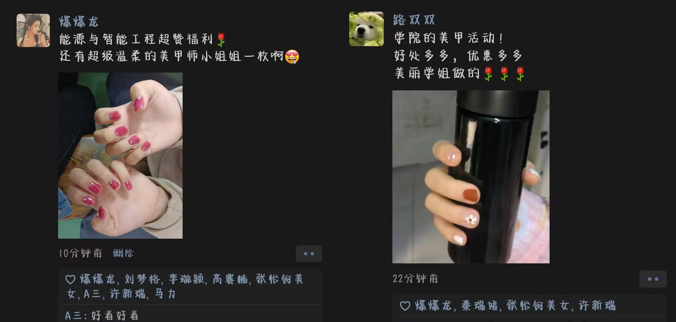 疫情当下,同学们积极配合疫情防控政策,在学校进行闭环管理。为丰富同学们的课余生活,增强校园生活的趣味性,缓解疫情期间心理压力,提升大学生外在审美素养和容貌自信,太阳集团tyc234cc党委牵头组织了一系列“学生互助小组”活动。同学们积极报名,弘扬志愿服务精神,在“精品美甲 定制修眉”志愿服务活动中化身指尖上的“益”术家,在北林校区开展了为期5天的美甲和修眉服务。