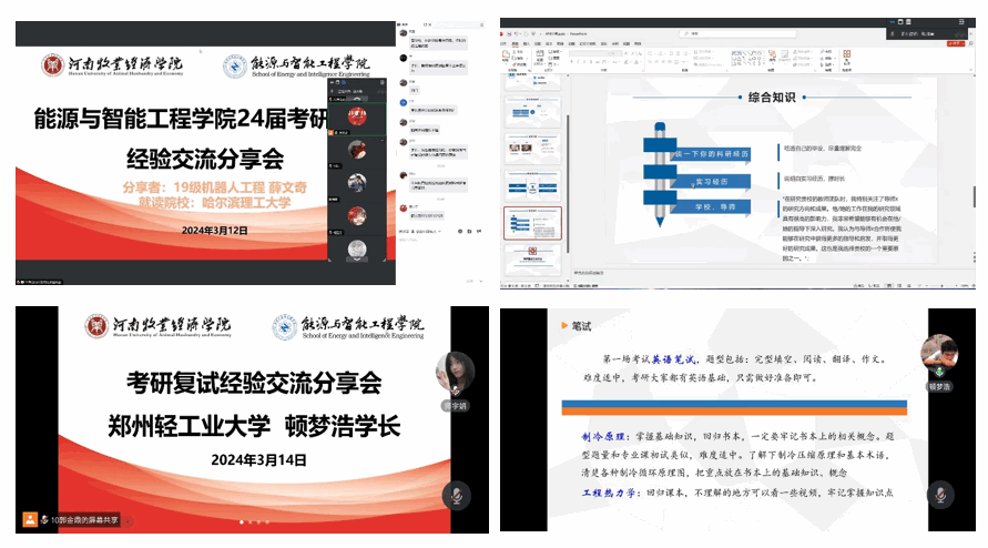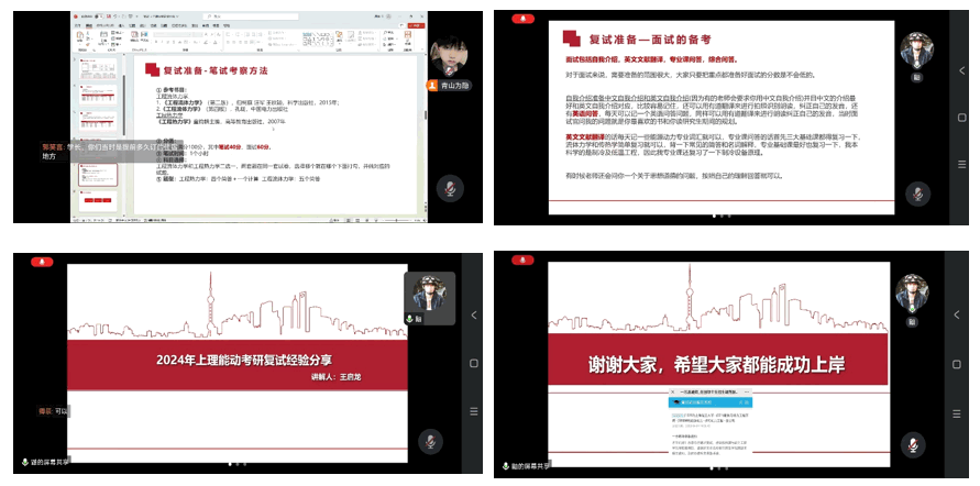 2024年研究生入学考试已到复试阶段,为帮助双能学子科学制定复试计划,并增进立志考研同学对考研的了解,太阳集团tyc234cc于3月12至3月15日连续组织5场“考研复试经验交流会”。此次交流会邀请学院2023届6位考研成功的优秀学长学姐,他们分别是考入新疆大学的张俊阳,哈尔滨理工大学的薛文奇,海南大学的张琰博,上海理工大学的王启龙,郑州轻工业大学的顿梦浩以及北京工业大学的周亚琴,为正在考研以及有意考研的2021、2022级本科生分享经验、答疑解惑。学院学风建设专干孔宁老师参与本次活动。