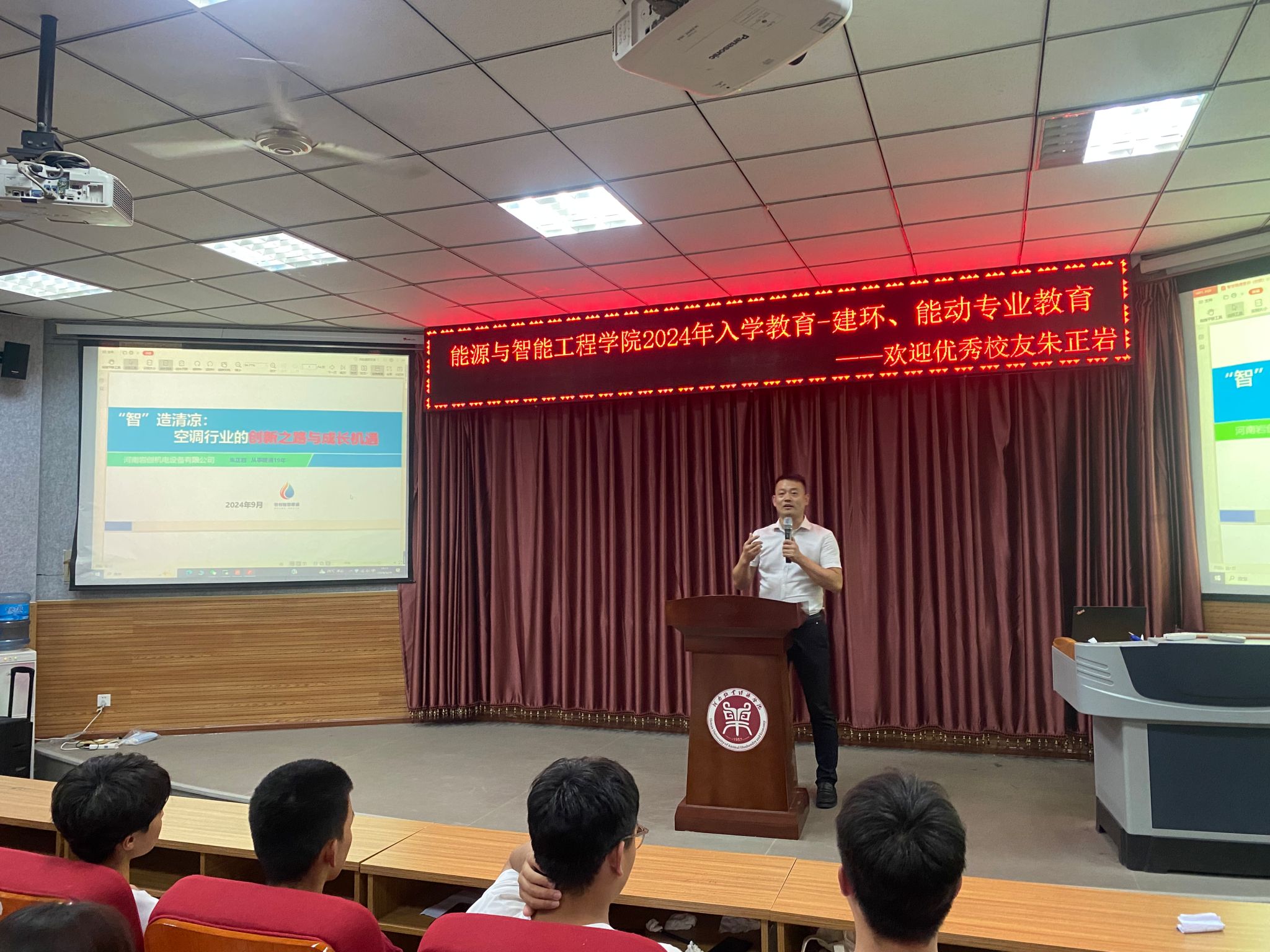 为了使2024级建环、能动专业新生充分了解自己所学专业,尽快明确学习目标,适应大学生活,做好未来职业规划,9月29日晚,学院邀请到2003届制冷与冷藏专业优秀校友、河南岩创机电设备有限公司董事长朱正岩,在北林校区教学楼A200教室开展了以《“智”造清凉:空调行业的创新之路与成长机遇》为题的专业教育讲座,讲座由建环专业教师耿李姗主持,169名新生参加了此次讲座。