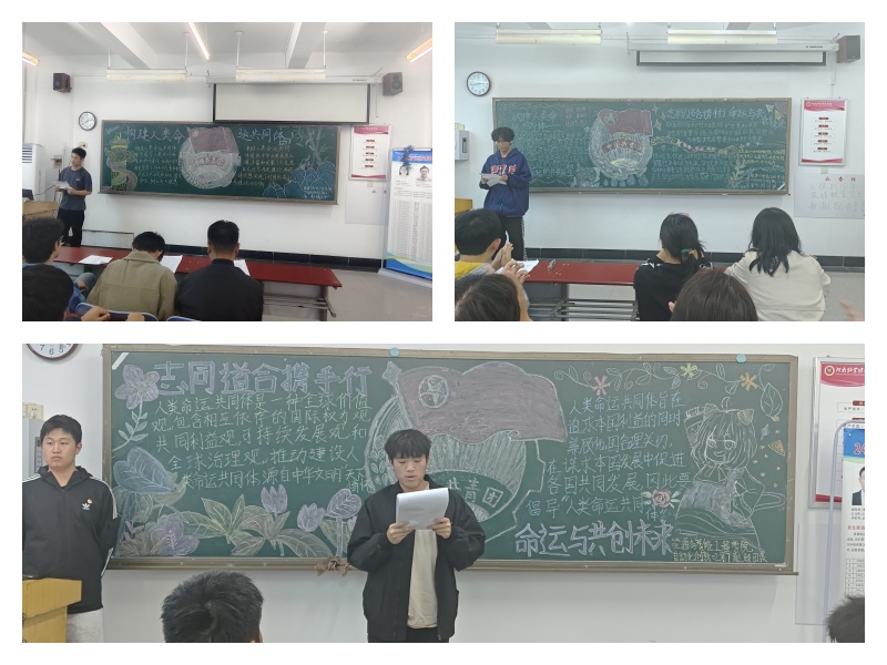 本次团课通过板报展示、PPT演讲、视频教学等多种形式开展,全方位、多层次地向同学们阐释了人类命运共同体的深远意义。首先,各班团支书通过PPT讲解,强调构建人类命运共同体理念是习近平外交思想的重要内容,也是中国特色大国外交的鲜明标识。它科学回答了“世界怎么了、我们怎么办”的时代之问,指明了不同国家、不同民族、不同文明的共同奋斗方向,展现了胸怀天下、面向未来,大道之行、天下为公的宽阔胸襟,对中国和平发展、世界繁荣进步具有重大而深远的意义。接着,通过外交部发言人答记者问的视频和一则青年大学习的主题团课视频,分别从不同方面阐述了中国基于人类命运共同体理念提出的系列理论主张和方针政策,展现中国在践行人类命运共同体理念,推动构建人类命运共同体上作出的不懈努力和生动实践。在讨论互动环节,同学们积极发言,表达了自己对构建人类命运共同体的理解和看法。同学们深刻领悟了“一花独放不是春,百花齐放春满园”的哲理,正如习近平总书记所指出的:“大道至简,实干为要。构建人类命运共同体,关键在行动。”在全球化的大潮中,各国命运紧密相连,唯有携手合作,方能共创繁荣。在这个互联互通的世界里,我们应当相互扶持,共同进步,为构建一个更加和谐美好的世界贡献己力。
