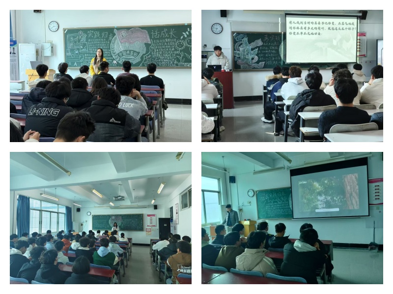 团课以“实践归来话成长”为主题,各团支书首先介绍寒假期间社会实践活动总体情况,随后同学们在团支书的带领下,以不同的形式开展了此次团课。各优秀寒假社会实践代表分享了在寒假社会实践活动中的收获和感悟:24级自动化创新01班的朱敬泰同学在寒假期间积极投身社会实践,深入河南省开封市兰考县仪封乡开展了一系列富有成效的活动。他与团队成员精心制作环保宣传海报,在乡村集市设立宣传点发放环保手册,并与当地志愿者共同开展街道清洁行动,向村民普及环保理念。此外,他还积极参与村委会组织的防诈宣传工作,通过策划集中讲座、播放防诈视频和开展互动问答等形式,有效提升了村民的防诈意识和辨别能力。24级自动化创新03班的王硕同学,寒假期间参加了巩义市桐和社区“青年大学生返家乡”社会实践活动。活动期间,他以实践大学生的身份参与了许多活动及工作,例如巩义市团委举办的“大学生联盟换届与观影”活动、巩义市书法协会的“写春联,绘年画”活动、网格入户宣传工作和商户消防设施的排查活动、面向辖区老年居民开展的健康关爱、安全宣传、社区反诈宣传活动等。24级自动化创新02班的张家馨同学,利用寒假时间来到位于巩义市新华路街道办货场路社区的便民服务中心,她协助服务中心的工作人员处理日常事务:为居民办理各类证件的资料审核与整理,包括老年证、生育证明等;并参与组织社区闲置物品交换活动,帮助居民搭建交流平台;与社区民警、工作人员一起在社区开展消防安全、防盗防骗等系列宣传活动。