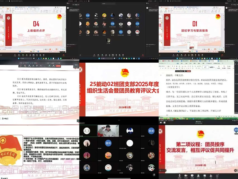 2026年1月29日至2月9日,学院各班团支部以线上方式召开2025年度组织生活会暨团员教育评议大会。本次会议以深入学习贯彻习近平新时代中国特色社会主义思想及党的二十届四中全会精神为核心,紧扣习近平总书记关于青年工作的重要思想,严格对标校团委部署。会议由各班团支书主持,辅导员及全体团员参加。