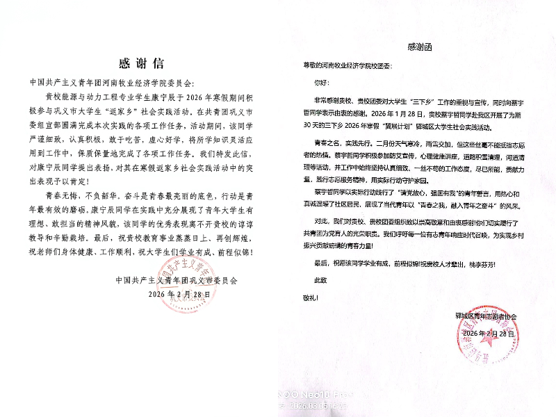 近日,我院收到来自共青团巩义市委员会、驿城区青年志愿者协会发来的感谢信,分别对25能动03班康宁辰同学、25建环03班蔡宇哲同学在2026年寒假“返家乡”和“三下乡”社会实践活动中的优异表现予以高度肯定,并对学院育人工作表示感谢。