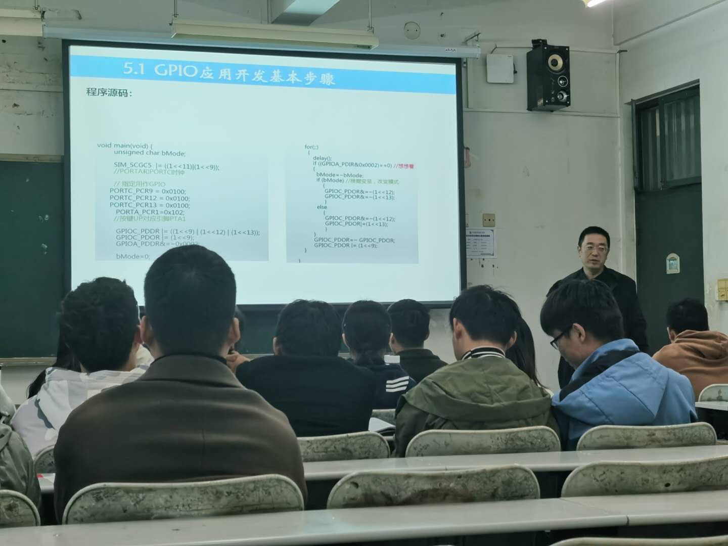 课堂上,王伟老师用了简洁干练的语言向同学们介绍了关于GPIO应用的基本原理,并向同学们介绍了GPIO应用的使用步骤。其生动的语言与方式进行这次研讨课,时刻调动着参与者的学习热情和探究精神,使这一节研讨课把同学们与老师联系在一起,让同学们积极的参与研讨观摩课的进行,更是解决了许多同学们关于GPIO应用的问题。王伟教师生动的讲解与自然沉稳的方式让同学们都融入与课堂与思考之中,得到同学们的一致好评。后排教师之间的教学经验交流,不仅推广先进了的课堂教学理念,也让大家了解现代教育教学方法,为我院建设储备一支师德高尚、业务精湛、充满活力的高素质专业化教师队伍打下了坚实的基础。