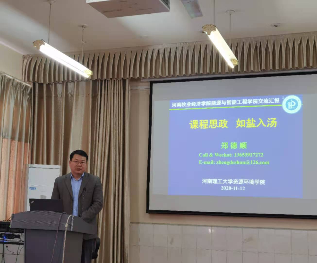 2020年11月12日下午,学院邀请河南理工大学资源环境学院的博士生导师郑德顺教授在院会议室作“课程思政如盐入汤”的专题报告,报告由周凯书记主持。
