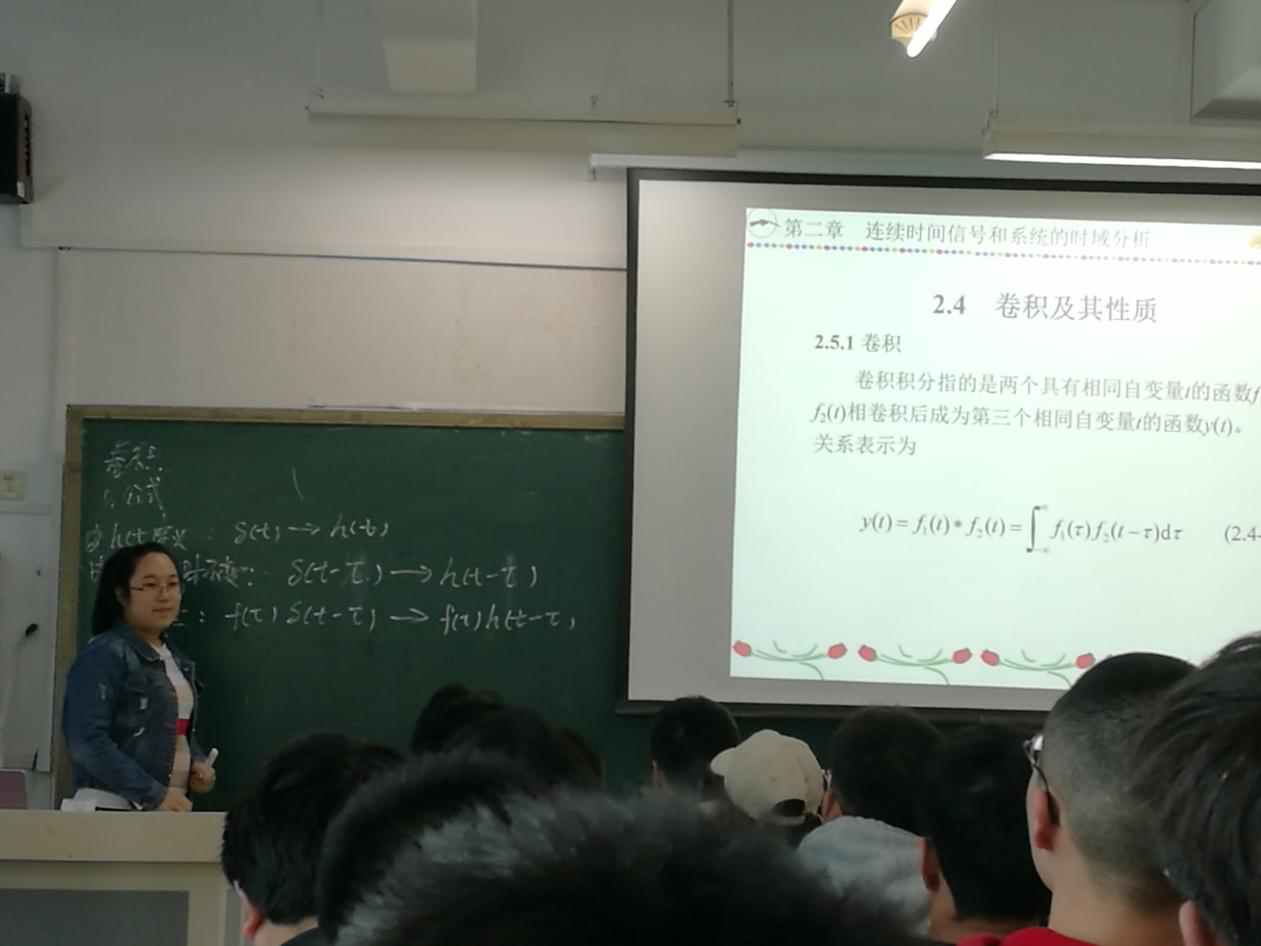 朱老师本节课讲授的内容是信号与系统中的卷积及其性质。朱老师首先对前一章的主要内容进行了回顾复习,梳理了新旧知识之间的内在联系,由已学过的知识,对卷积进行了一个知识引入,强调了卷积在信号处理过程中重要性。朱老师强调卷积是解决信号与系统中信号分解的重要手段之一。本节课主要讲授卷积的公式和主要性质,以及卷积的具体解法—图解法。在讲授中列举了典型的例子,深入浅出地对卷积的定义和性质及应用进行了细致的讲解,将抽象的内容具体化、生动化,学生听得津津有味。