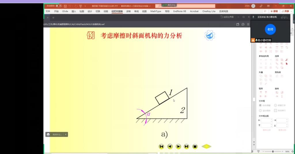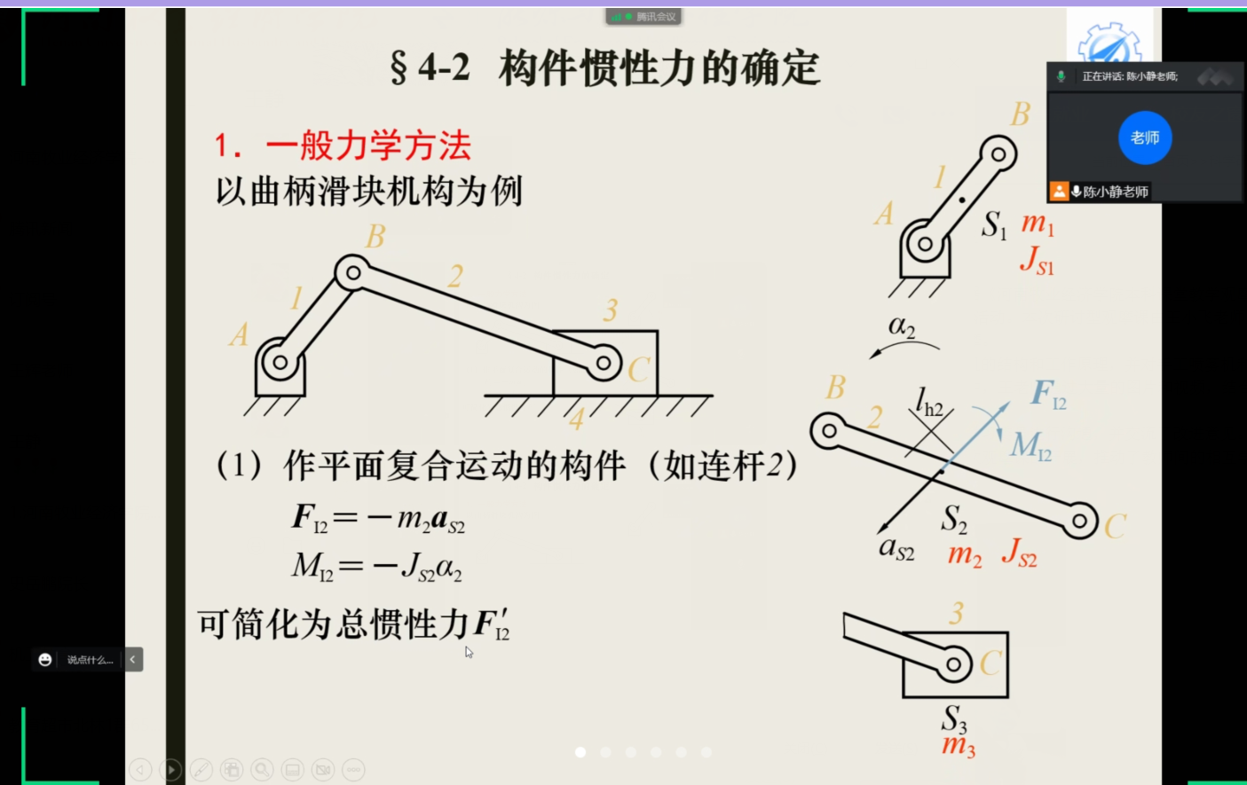 陈小静老师首先对上章的主要知识点进行了回顾,并积极与学生互动以巩固所学知识。由我国神舟十四号航天员乘组成功出舱,以及我国辽宁舰、山东舰、福建舰的依次下水,使学生深切感受到建国以来我国的航天、航海事业的飞速发展,增强了学生的民族自豪感,激发了学生对专业知识的学习热情,引出了本节课的讲授内容-平面机构的力分析,进一步强调了平面机构的力分析在装备发展中的重要性。陈小静老师结合实例及动画展示,对作用在机构上的力进行了分析,对于构件的惯性力进行了讲解,并通过课堂练习以及提问环节加强了知识的巩固,提高了学生分析问题解决问题的能力。陈小静老师的授课内容丰富,逻辑严谨清晰,师生互动效果好,并通过动画展示增加了课堂的趣味性,使学生更易理解理论知识。