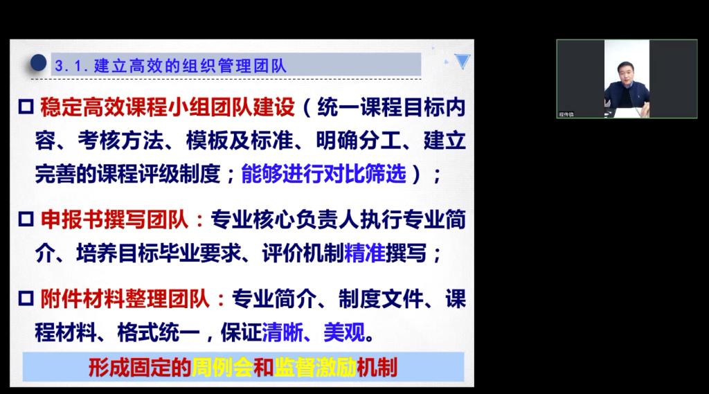 会上,程教授首先介绍了郑州轻工业大学能源与动力工程专业发展情况,接着就工程教育认证工作必要性与紧迫性进行分析,指出工程认证是专业高质量发展必然要求。随后程教授分别从建立高效的工程认证工作团队、完善培养目标和毕业要求做好顶层设计、制定标准模板全面提高课程材料质量和注重细节精益求精四个方面,结合郑州轻工业大学在工程认证教育申请工作中的经验进行详细的分享。程教授用生动的案例诠释工程教育认证过程中容易出现的问题和错误,为我们后期开展工程教育认证指明了清晰的方向。会议最后,史岳鹏副院长代表学院对程教授细致充分的讲解培训和经验分享表示了感谢,对能源与动力工程和学院其他专业下一步工程认证推进工作进行了再布置。