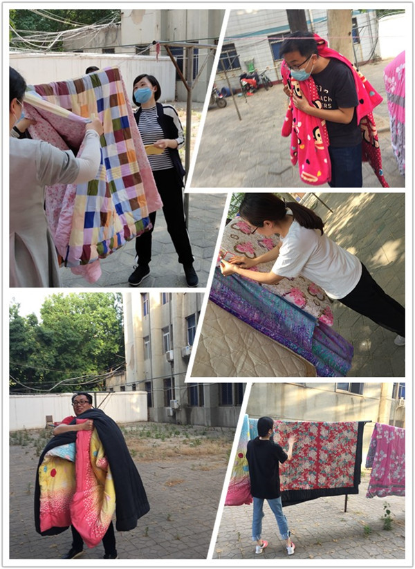 晒被子是个辛苦活儿,时不时还要给被子“敲敲打打”、“翻个身”,从晒被子到收被子,从楼上到楼下,每个人都是一身灰,一头汗。年轻的辅导员们开玩笑的说到:“家里这种辛苦的差事都自己都没干过,没想到今天为了咱们学生跑上跑下N趟,虽然辛苦,但是一想到咱学生返校后可以直接入住,竟也不觉得累”。经过一天的忙碌,当天统计的40多床被子全部完成了晾晒。