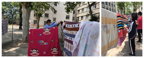 辅导员老师们搬被子、运被子、晒被子等热火朝天的干活