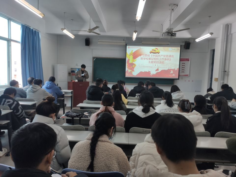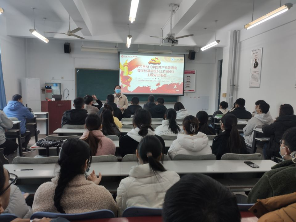 2021年12月9日太阳集团tyc234cc学生第二党支部在教学楼A503开展了学习贯彻《中国共产党普通高等学校基层组织工作条例》主题党日活动。此次活动由纪律委员彭江博同志主持并带领学生第二党支部全体党员同志学习本次主题党日活动主要内容。