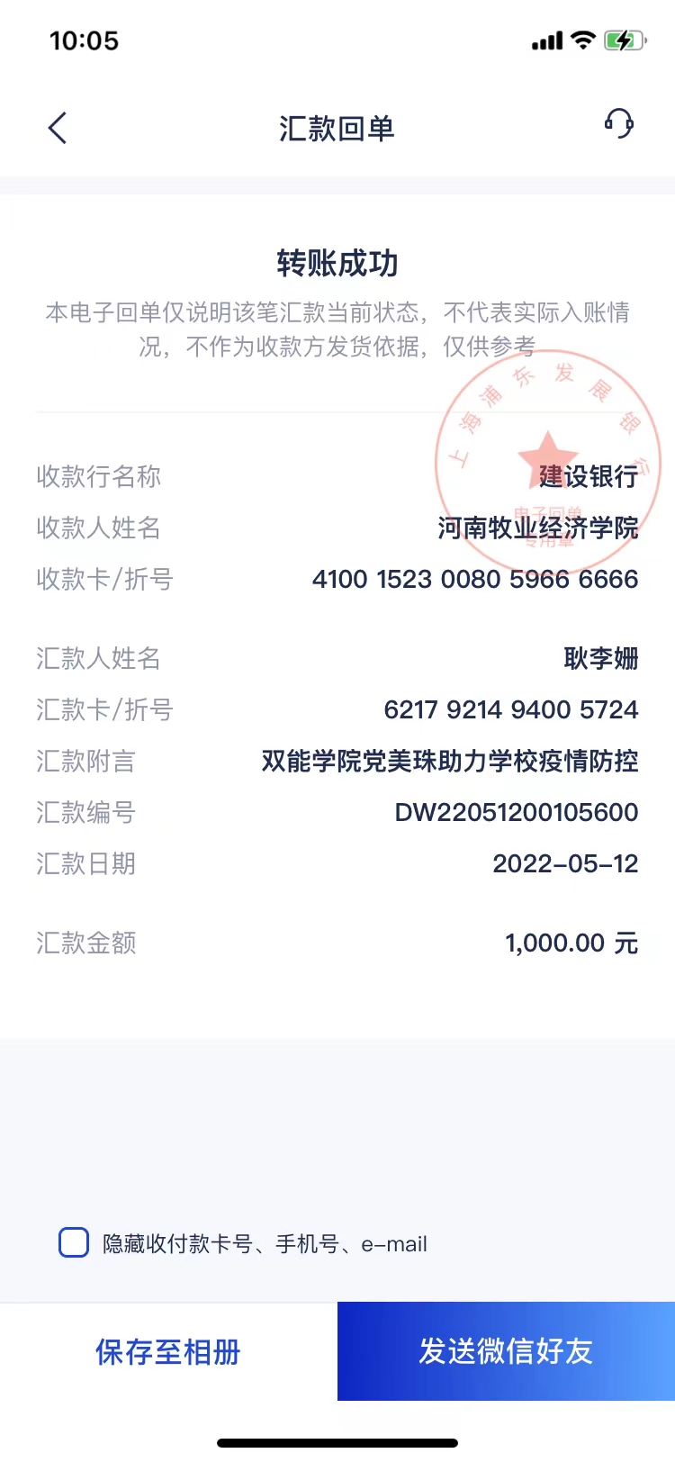 院党委副书记党美珠老师,尽管身在武汉读博,却心在北林校园,时刻关注在校师生的状况,第一时间远程线上向学工队伍传授学生管理的经验和方法,帮助学工队伍稳定学生情绪、理清工作思路、明确工作重点、细化工作任务,并向学校捐赠1000元人民币,为学校采购防护物资贡献力量。