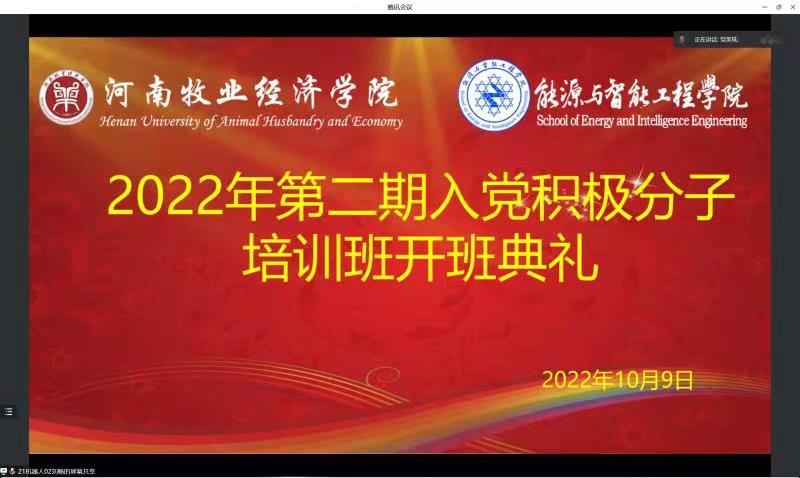 为深入学习习近平新时代中国特色社会主义思想、党的十九大及十九届历次全会精神,贯彻落实新时代党的建设总要求和新时代党的组织路线,严格党员发展程序,保证新发展党员质量,不断提高入党积极分子的思想政治素质和政治理论水平,端正入党动机,坚定理想信念,2022年10月9日晚,太阳集团tyc234cc于线上举办第二期入党积极分子集中培训班开班典礼。太阳集团tyc234cc党委书记周凯、院党委副书记党美珠、院团委副书记吴彦生、李永振、全体辅导员老师以及80名入党积极分子参会。开班典礼由吴彦生主持。
