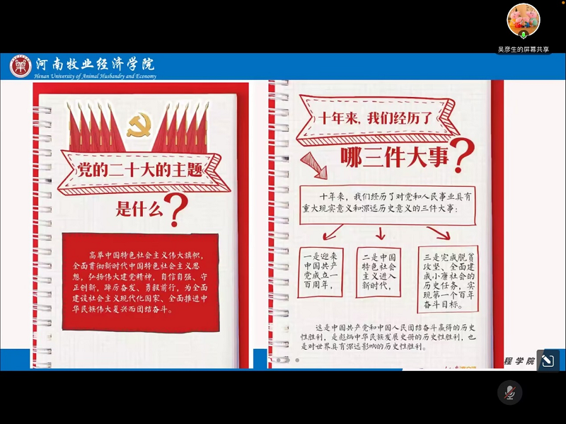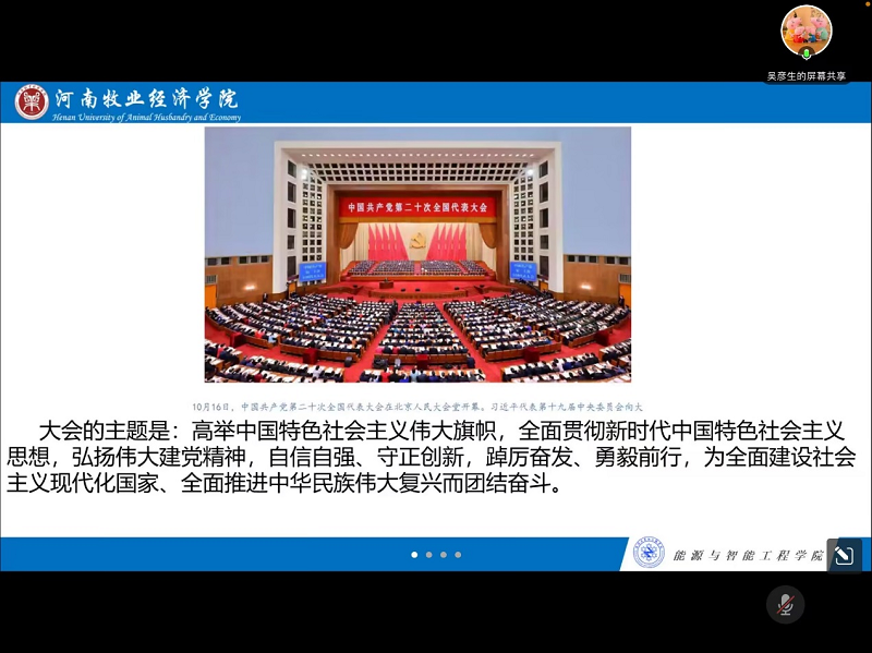 会上,吴彦生带领支部党员一起从党的二十大的主题、中国共产党现阶段的中心任务、全面建成社会主义现代化强国的战略安排等内容开始,较深入的学习了党的二十大精神。吴彦生老师指出,作为大学生党员,支部党员要将学习宣传贯彻党的二十大精神作为当前和今后一个时期的首要政治任务,要深刻领悟“两个确立”的决定性意义,增强“四个意识”、坚定“四个自信”、做到“两个维护”;要时刻牢记习近平总书记的嘱托,将自身的发展与国家民族的发展紧密结合在一起,为实现中国梦、实现第二个百年奋斗目标贡献青春力量!结合当前学校的疫情防控各项决策部署,吴彦生要求党支部的学生党员继续发挥模范带头作用,发挥“双包干”制度中党员的骨干作用,积极投身到疫情防控、志愿服务、和文明劝导工作中去。