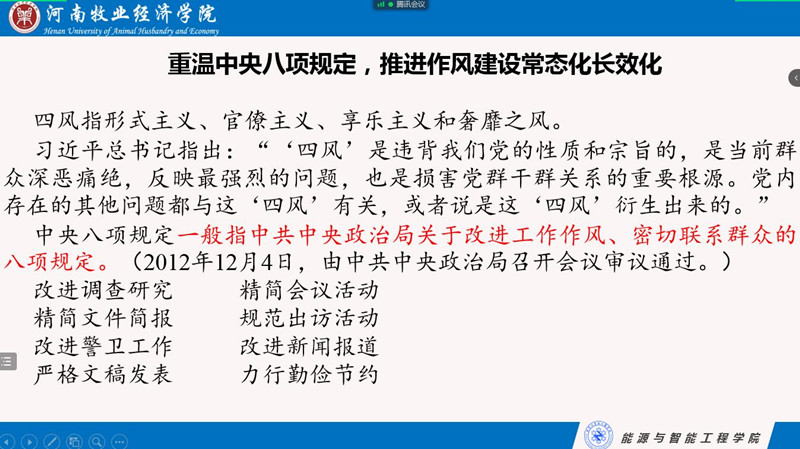 支部纪检委员席智宏带领大家重温了中央八项规定。十年来,以习近平同志为核心的党中央把中央八项规定作为加强作风建设的切入点、全面从严治党的突破口,写下作风建设新篇章,开创全面从严治党新局面。席智宏号召支部全体党员要时刻做到自警自省、慎终如始。
