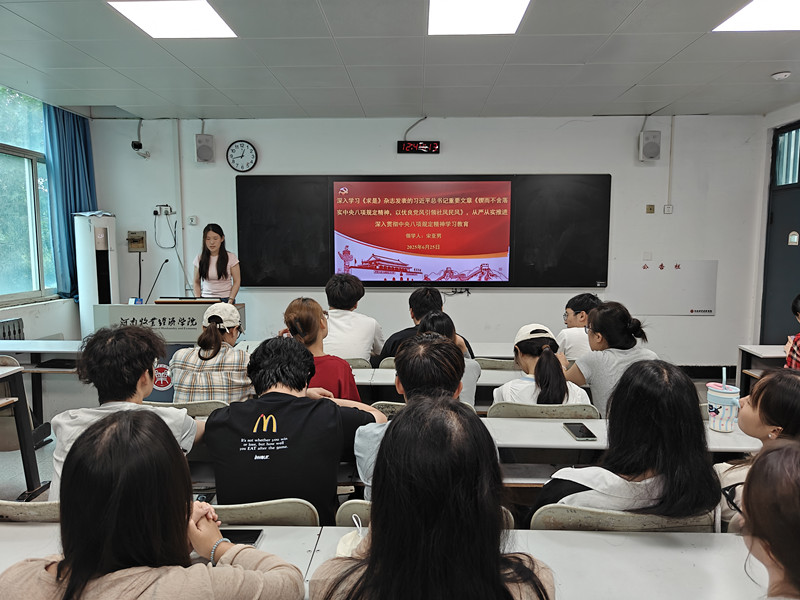 最后,支部书记李永振做总结发言并对支部近期工作进行了安排,号召支部学生党员要深入学习贯彻中央八项规定精神和习近平总书记在河南考察时的重要讲话精神,自警自省,志存高远,砥砺奋进,努力成才,为建设教育强国、为学校早日建成高水平应用型大学贡献力量! (文/图 李永振)