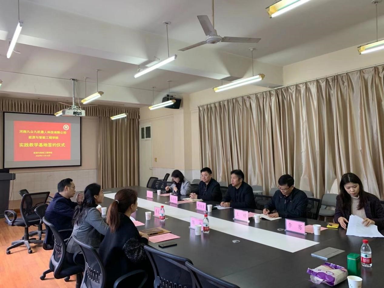 隋继学院长首先简要介绍了学院的基本情况。当前我院正持续向社会和企业输出高素质的应用型专门人才,坚持实现学校、学生、企业三赢的目标。接着,李总介绍了企业的基本情况,河南九众九机器人科技有限公司主要研发、生产、销售工业机器人,研发推广智能制造系统,为客户提供机器人自动化产线解决方案等。已与清华大学、河南工业大学、海尔集团等进行战略合作,积极为高校提供学生实习指导、就业推荐、实践基地培训等。隋院长对九众九机器人的行业实力给予肯定,对公司预计给学生提供的实践学习平台表示感谢,强调要将双方的合作做实做细。