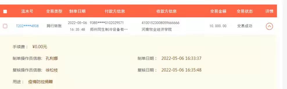 郭月生校友是我校2002届冷冻冷藏专业毕业生,也是河南郑州同生制冷设备有限公司总经理。在2020年疫情初次出现时,他就曾第一时间带着防疫物资驱车驰援母校。在此次我校因疫情陷入危急之时,在看到我院党委副书记党美珠转发的《致太阳集团tyc234cc校友的一封信》后,郭月生校友再次伸出援手,向我校捐助一万元以解燃眉之急。