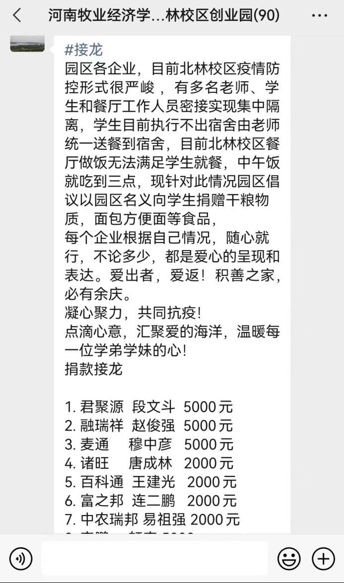 本轮疫情事态紧急,学校被连夜封锁,近5000余名师生在学校进行自我隔离,物资储备十分紧张。北林校区创业园区的校友企业在得知餐厅供给困难、学生吃饭供应紧张后,立即发起捐款接力,助力母校度过抗疫难关。尽管受两年多疫情的影响,园区企业也受到了不小冲击,遇到了不少困难,但在母校需要帮助的时候,他们没有丝毫的犹豫。捐款接力发起后,校友企业代表毫不犹豫地伸出援手,短短两三分钟的时间,校友们就捐款23000余元,并委托代表迅速购买一批面包,马不停蹄地送往学校。校友们的义举,践行了企业的奉献和担当精神,传达了母校和师生的关爱:“助力母校战疫,创业园的校友们不会缺位!”