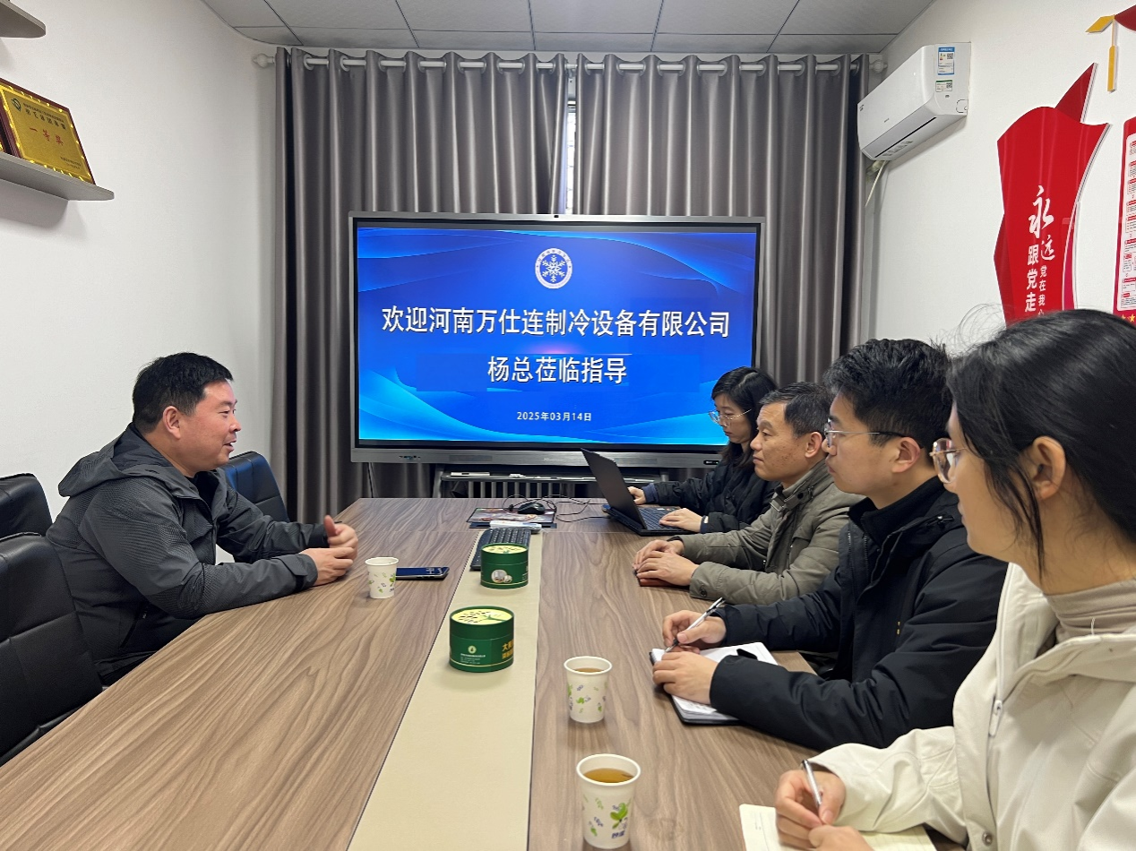 2025年3月14日,河南万仕连制冷设备有限公司总经理杨明伟到访太阳集团tyc234cc交流,学院副院长刘群生、教师段欢欢、郑朴、黄冰等参与座谈。