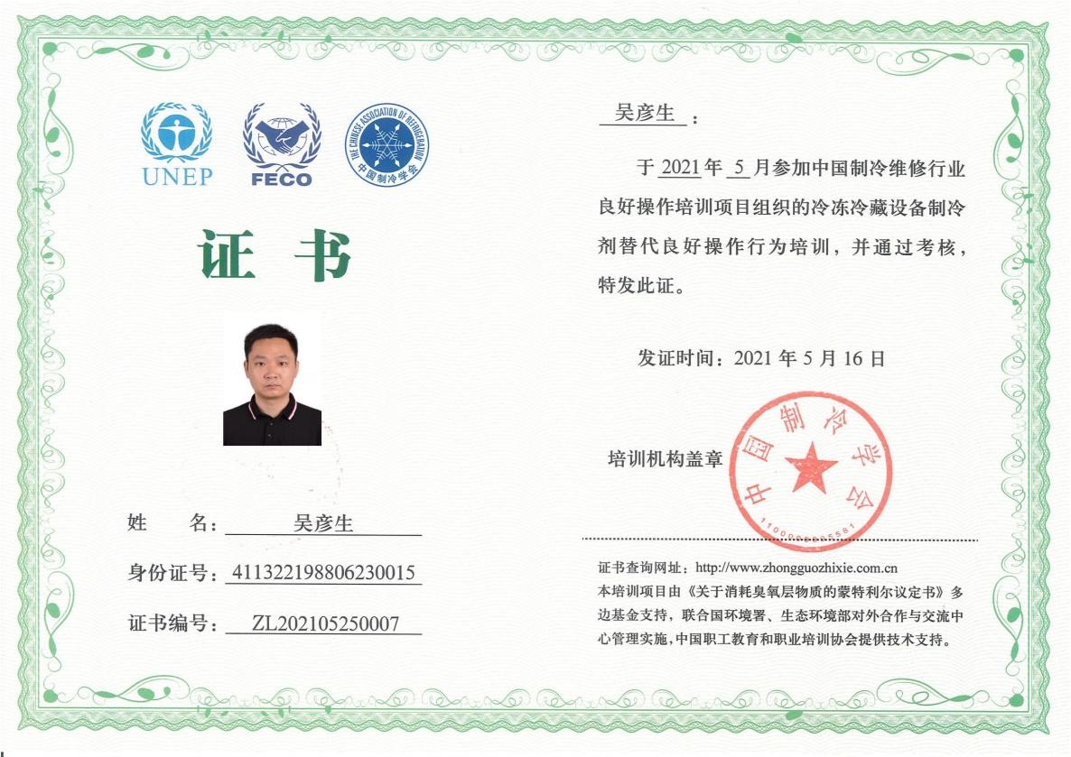 此次培训,不仅使培训学员进一步了解了冷冻冷藏设备制冷剂替代的最新趋势,掌握了冷冻冷藏设备制冷剂良好操作行为规范,而且为我国制冷行业普及《消耗臭氧层物质管理条例》的工作提供了有效的帮助,在减少消耗臭氧层物质(ODS)使用习惯、冷冻冷藏设备制冷剂良好操作行为等方面打下了良好的基础。